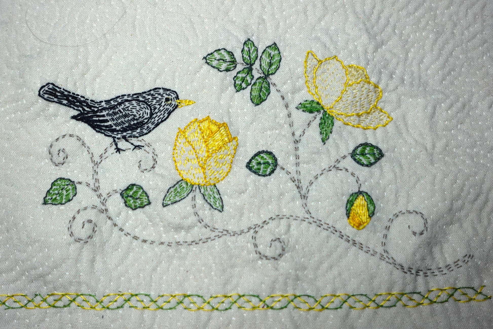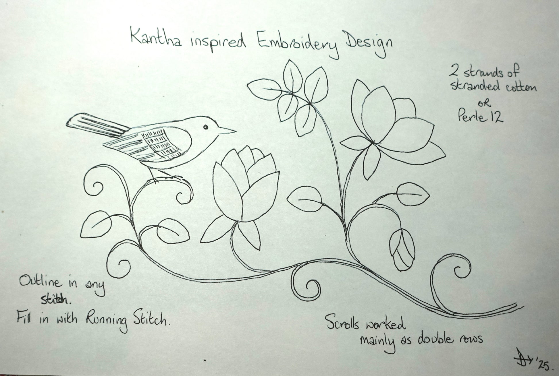 A simple bird and rose design for you to practice Kantha embroidery.